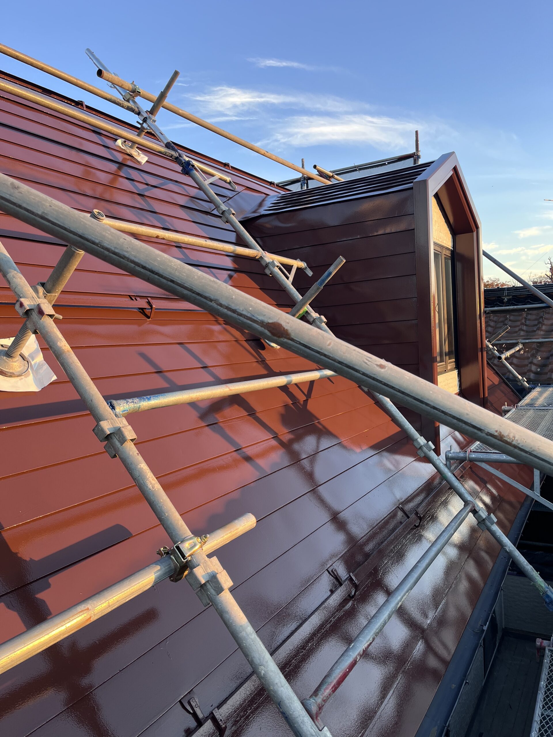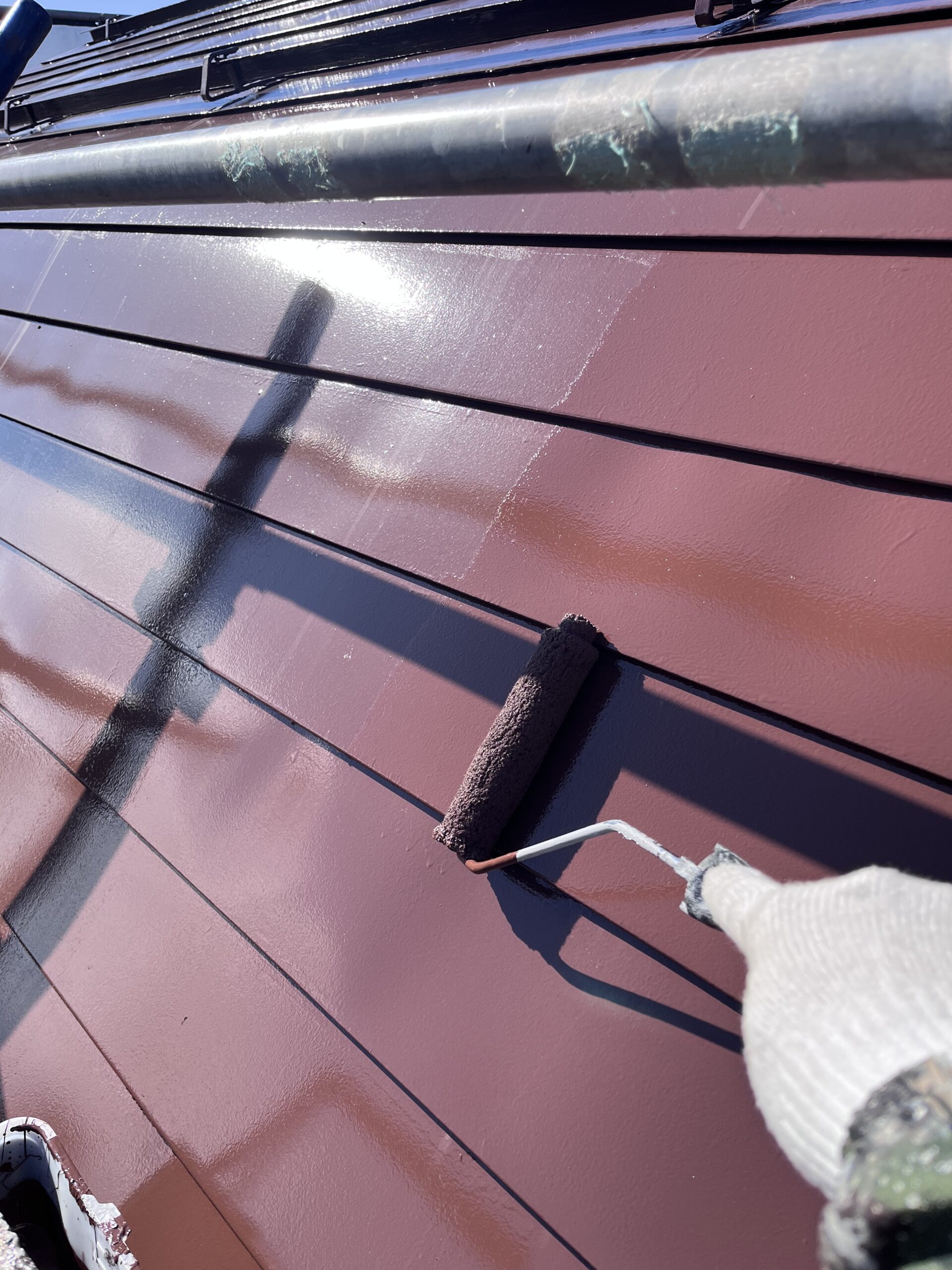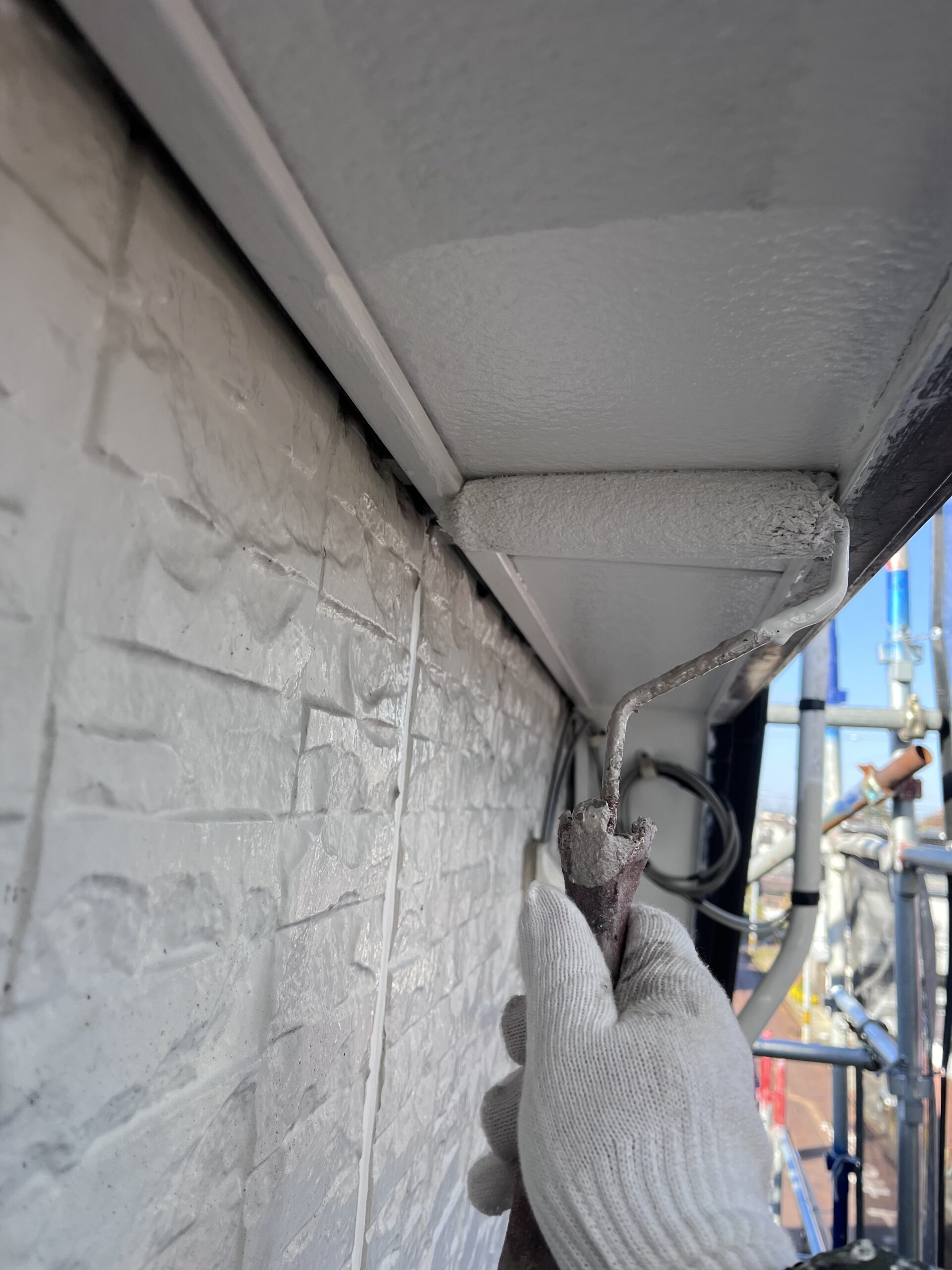 屋根上塗り仕上げて軒天1回目