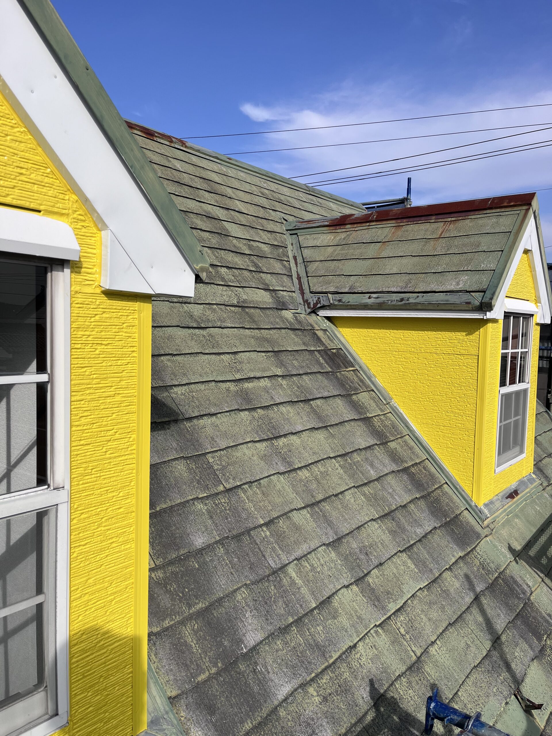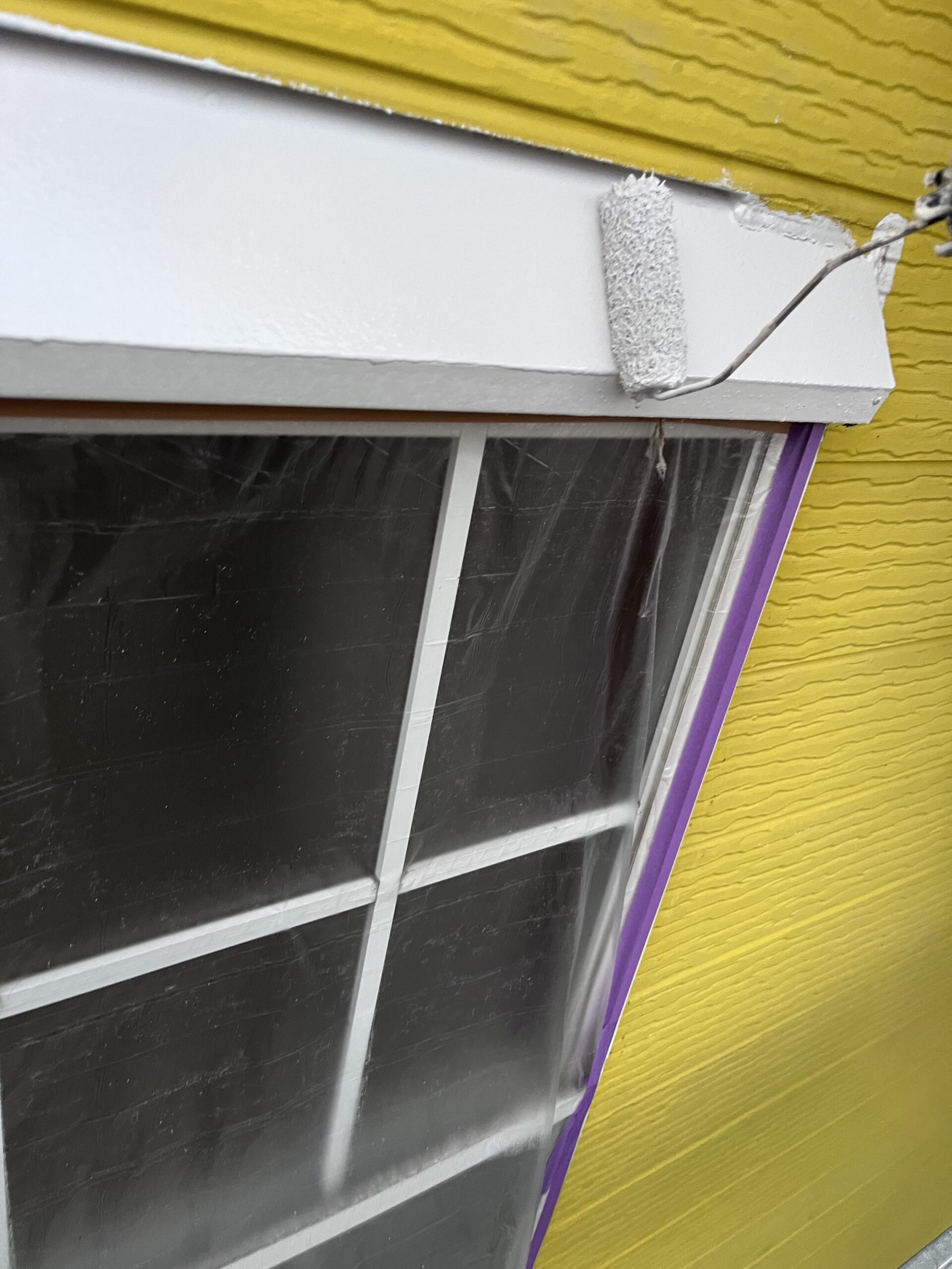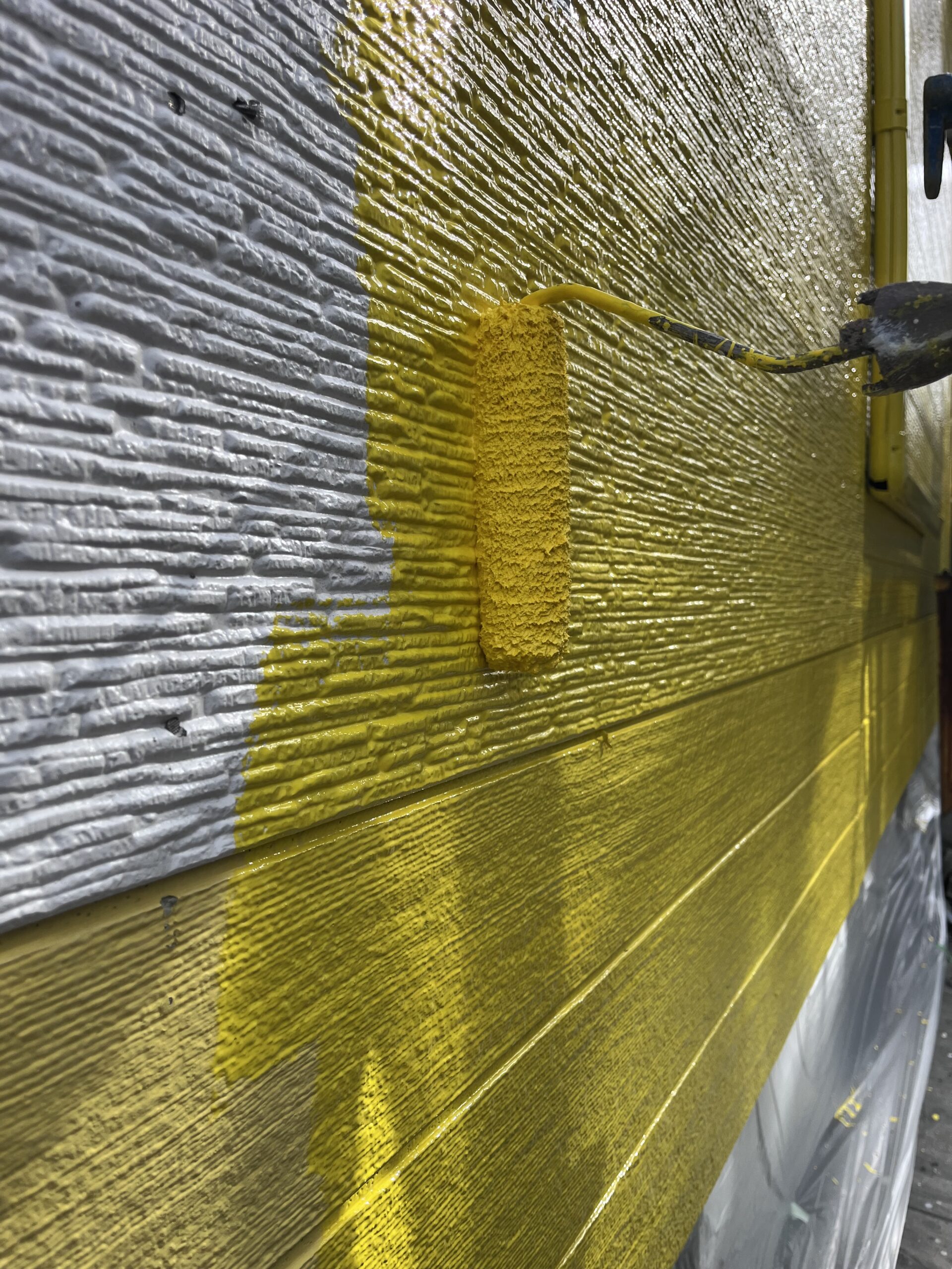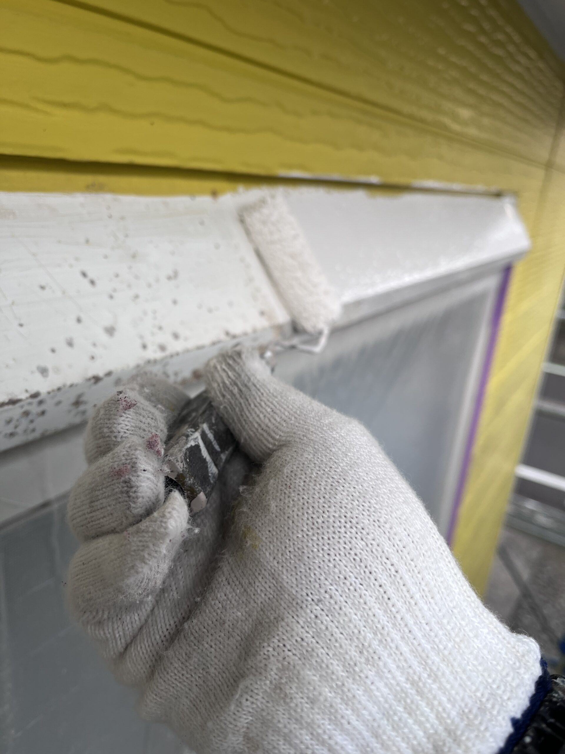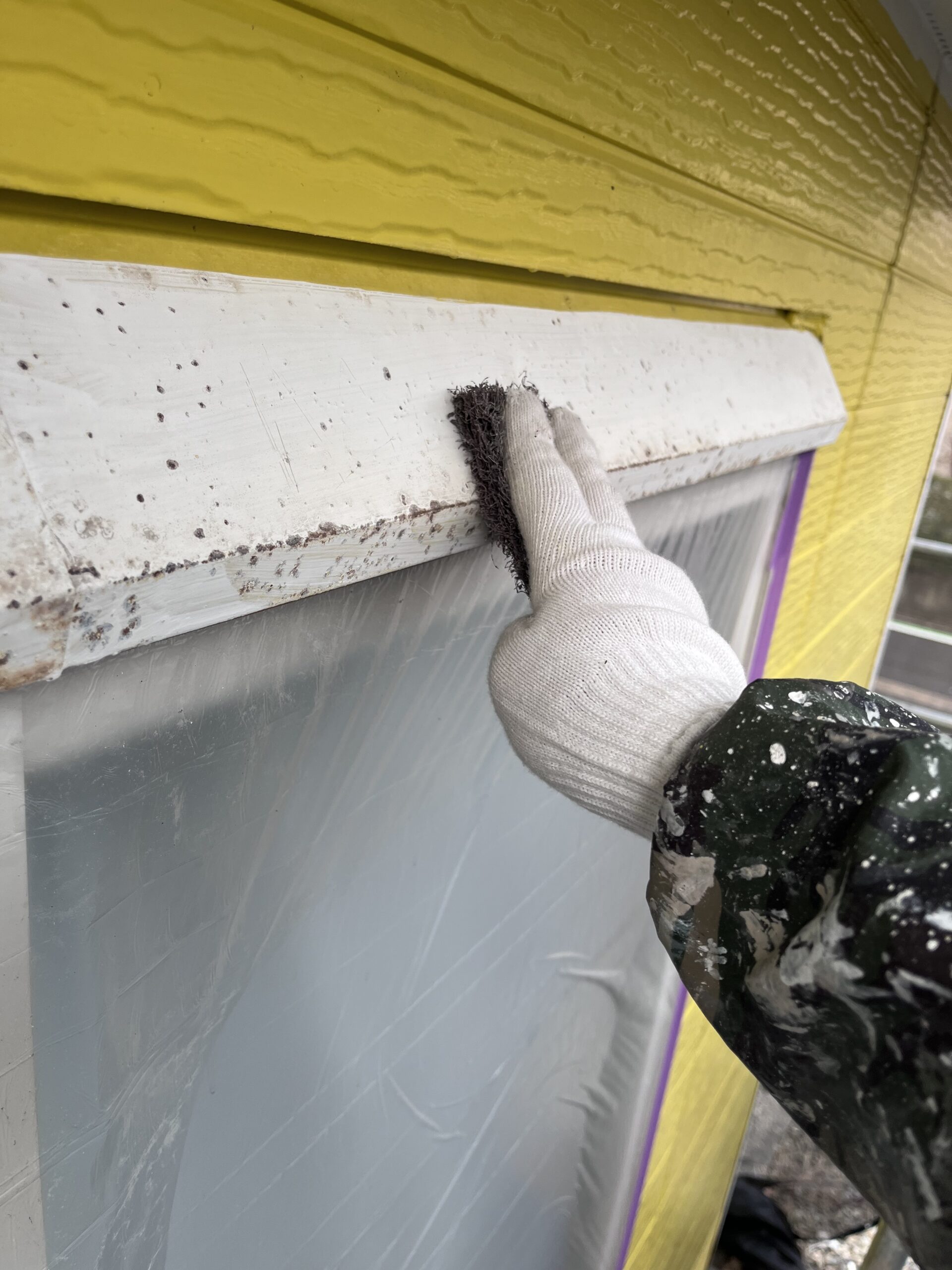 鉄部ケレン錆び止め、外壁一部下塗り、雨養生