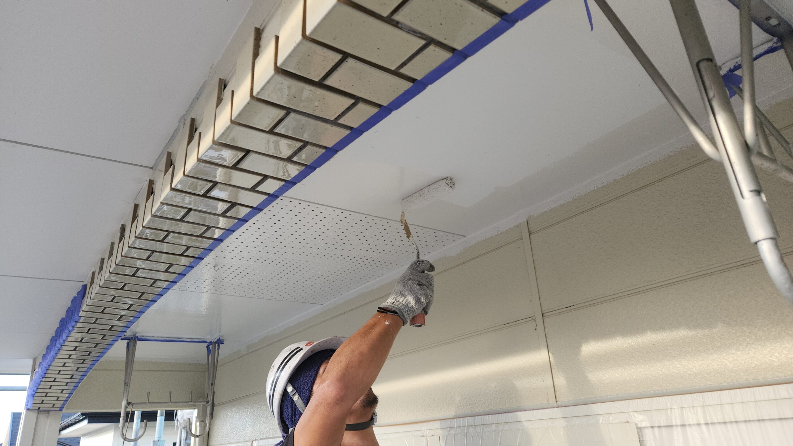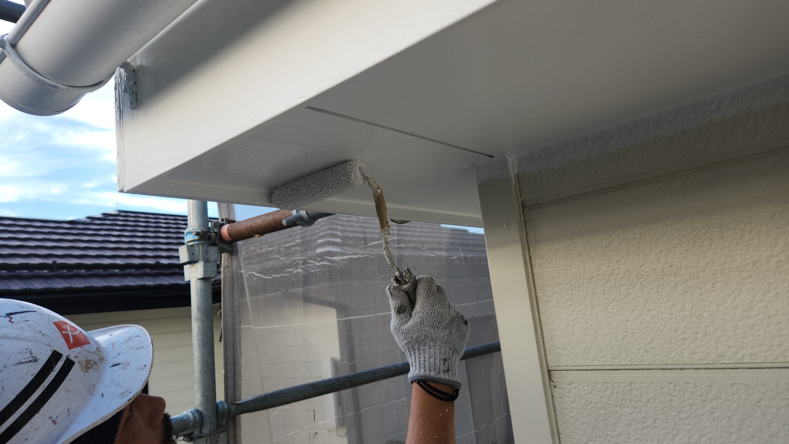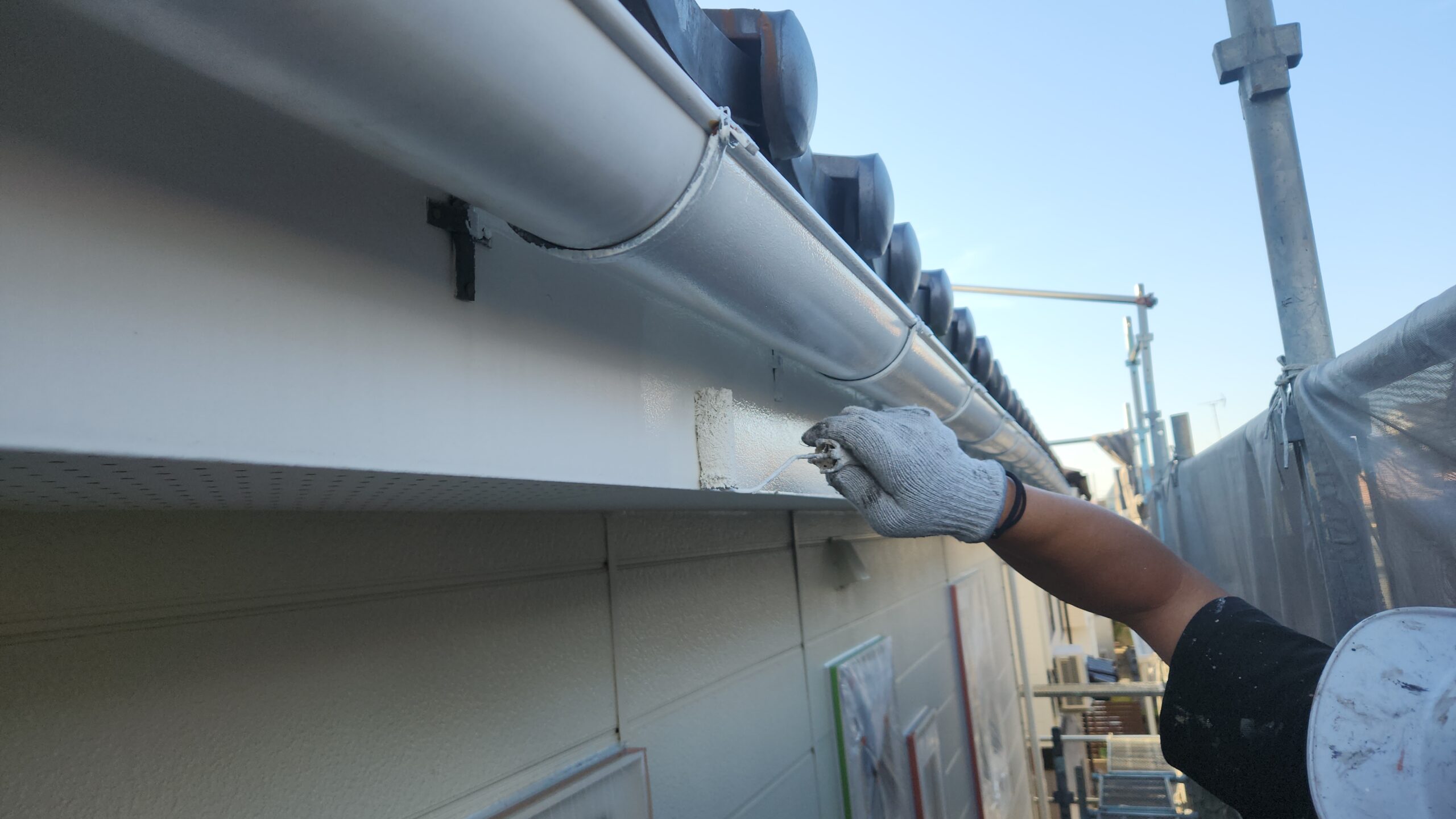 軒天の中、上塗りと軒樋、破風の中塗りと幕板の補修をしました。