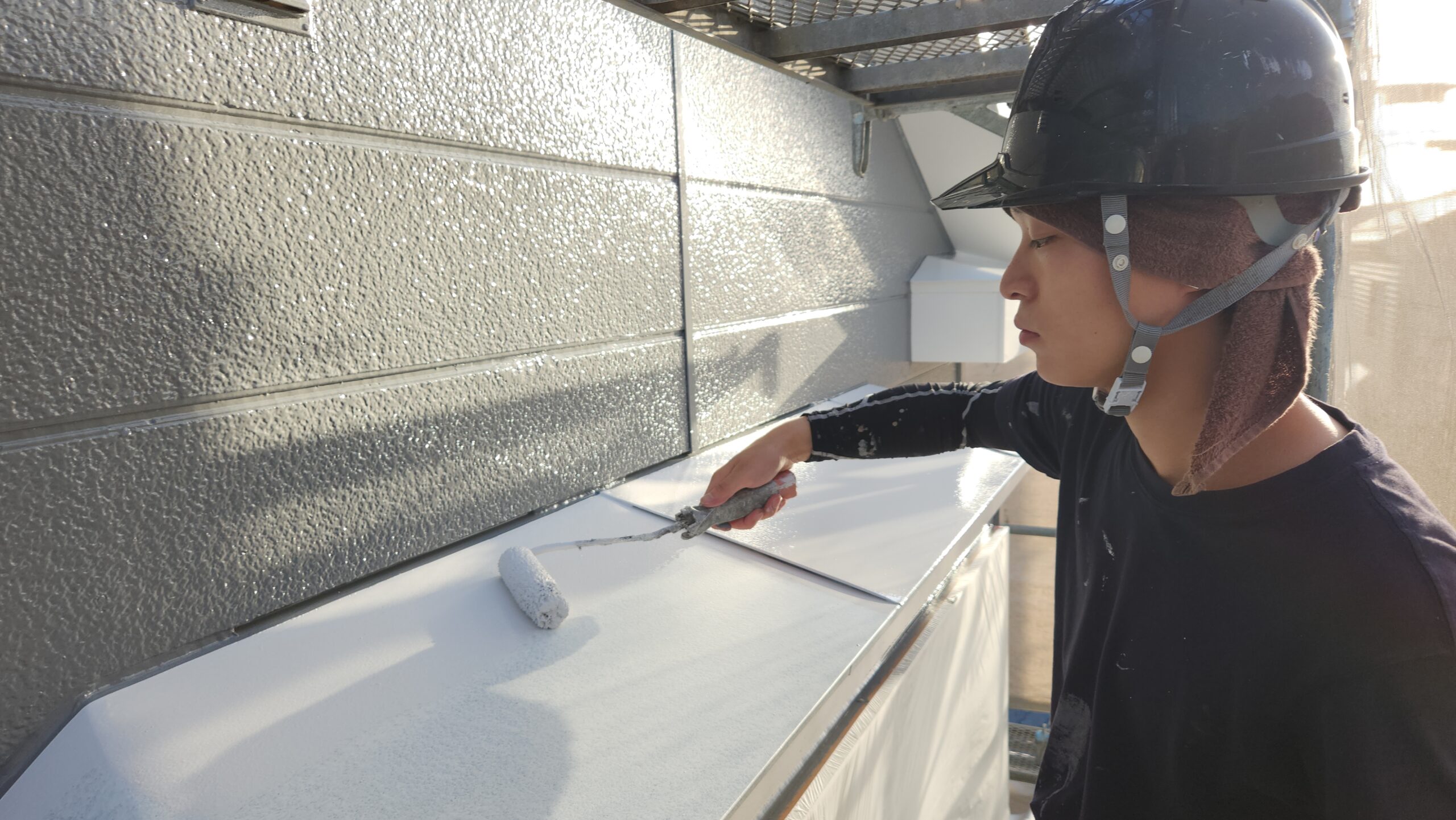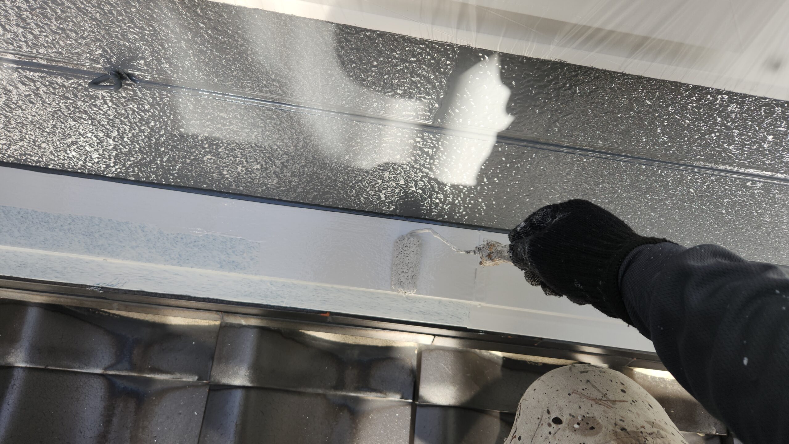 外壁の中塗り、上塗りと霧余け雨押えの上塗りをしました。