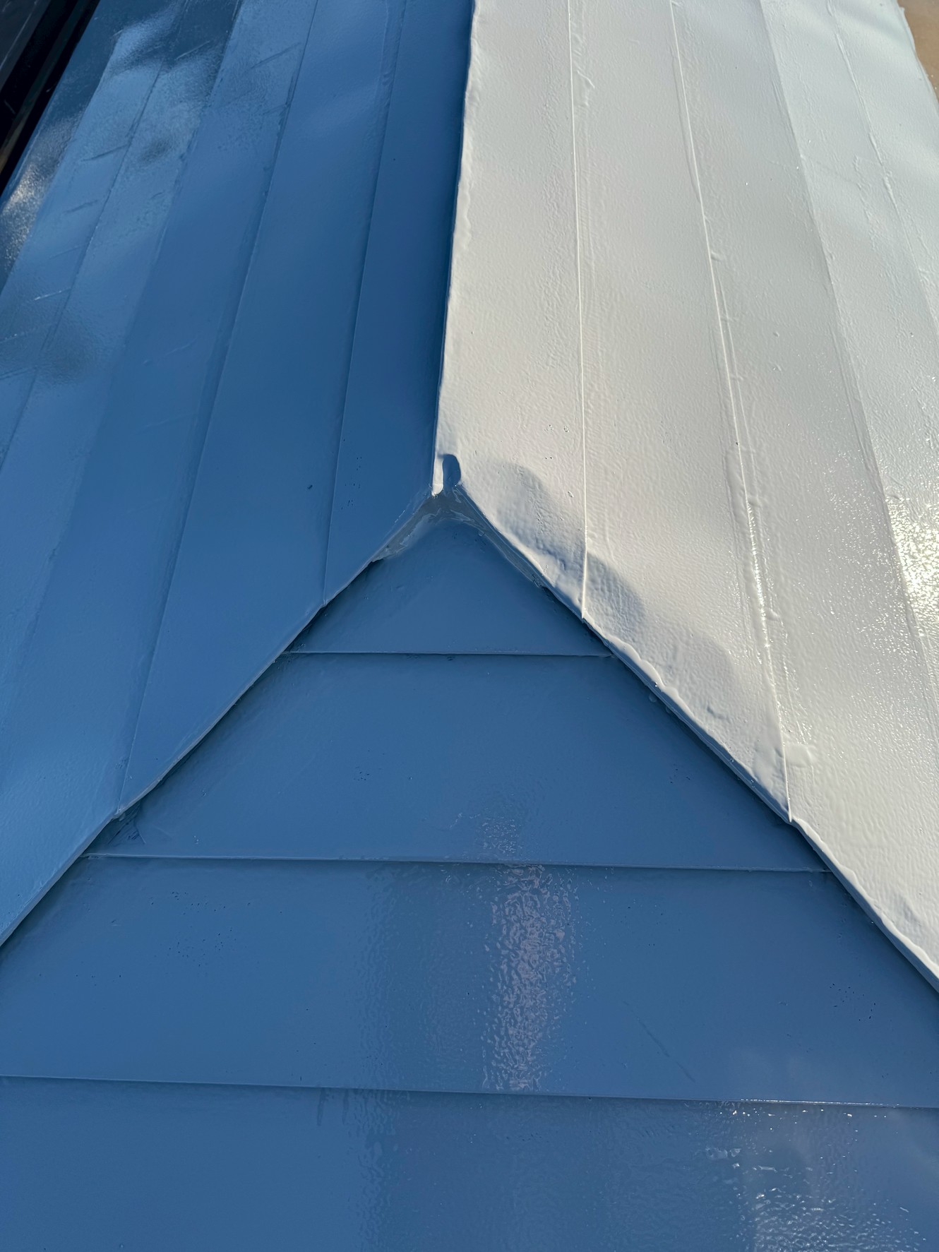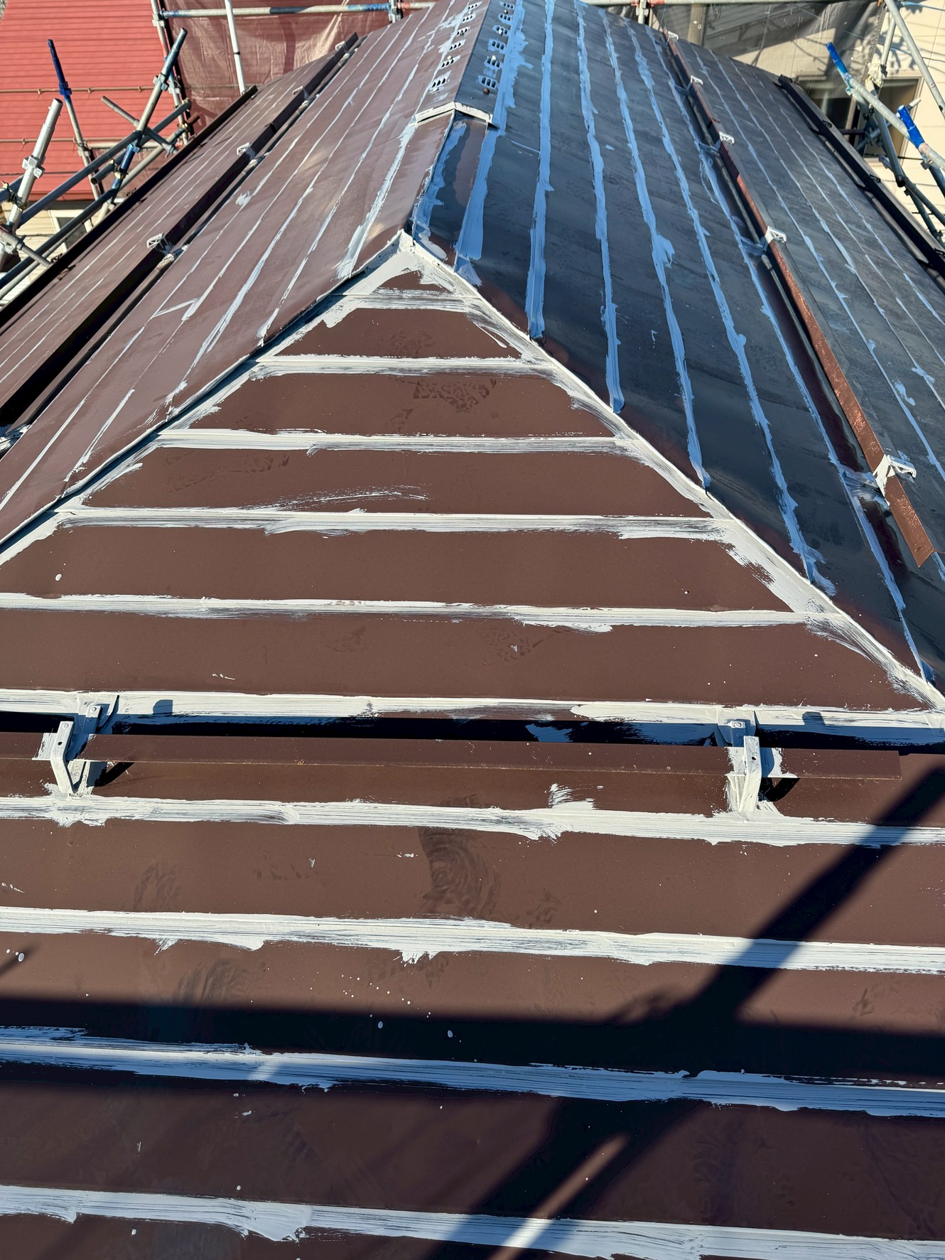 縦目地、窓まわり シーリング工事が終わりまして、屋根サビ止め入れました。
