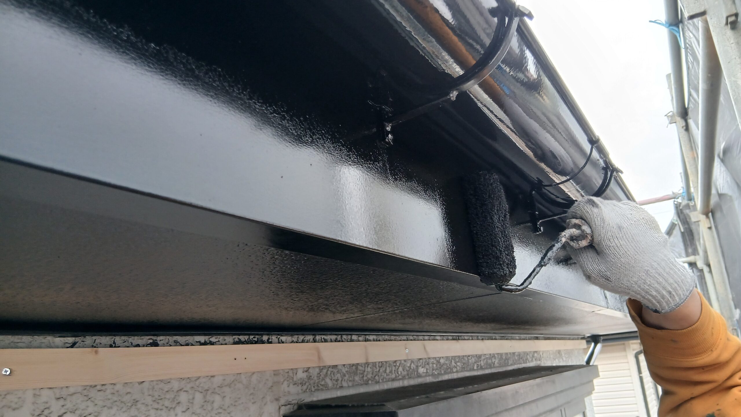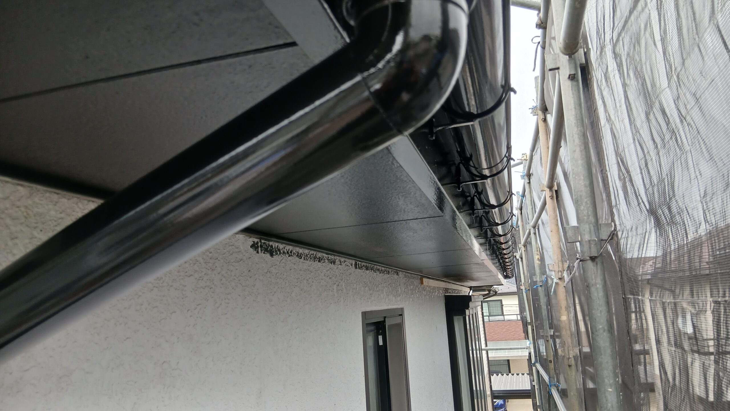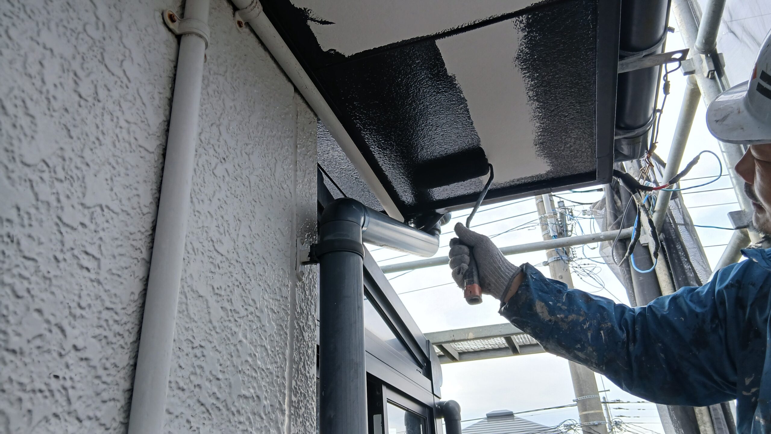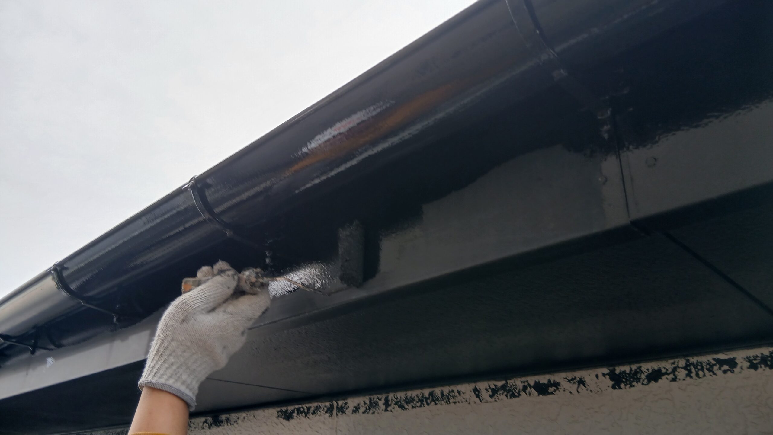 軒天、破風、雨樋、シャッターBOXの中塗り、上塗りをしました。