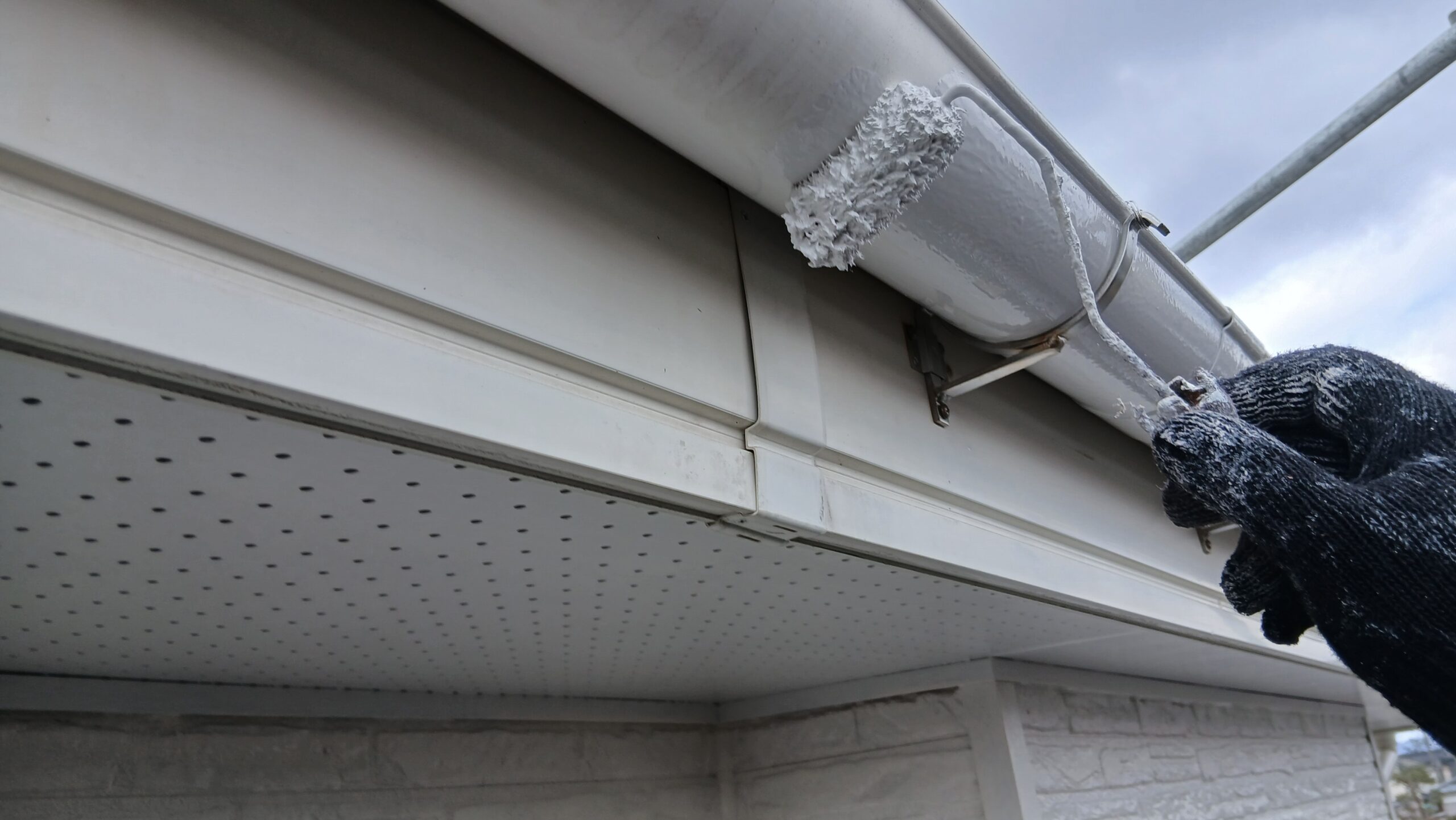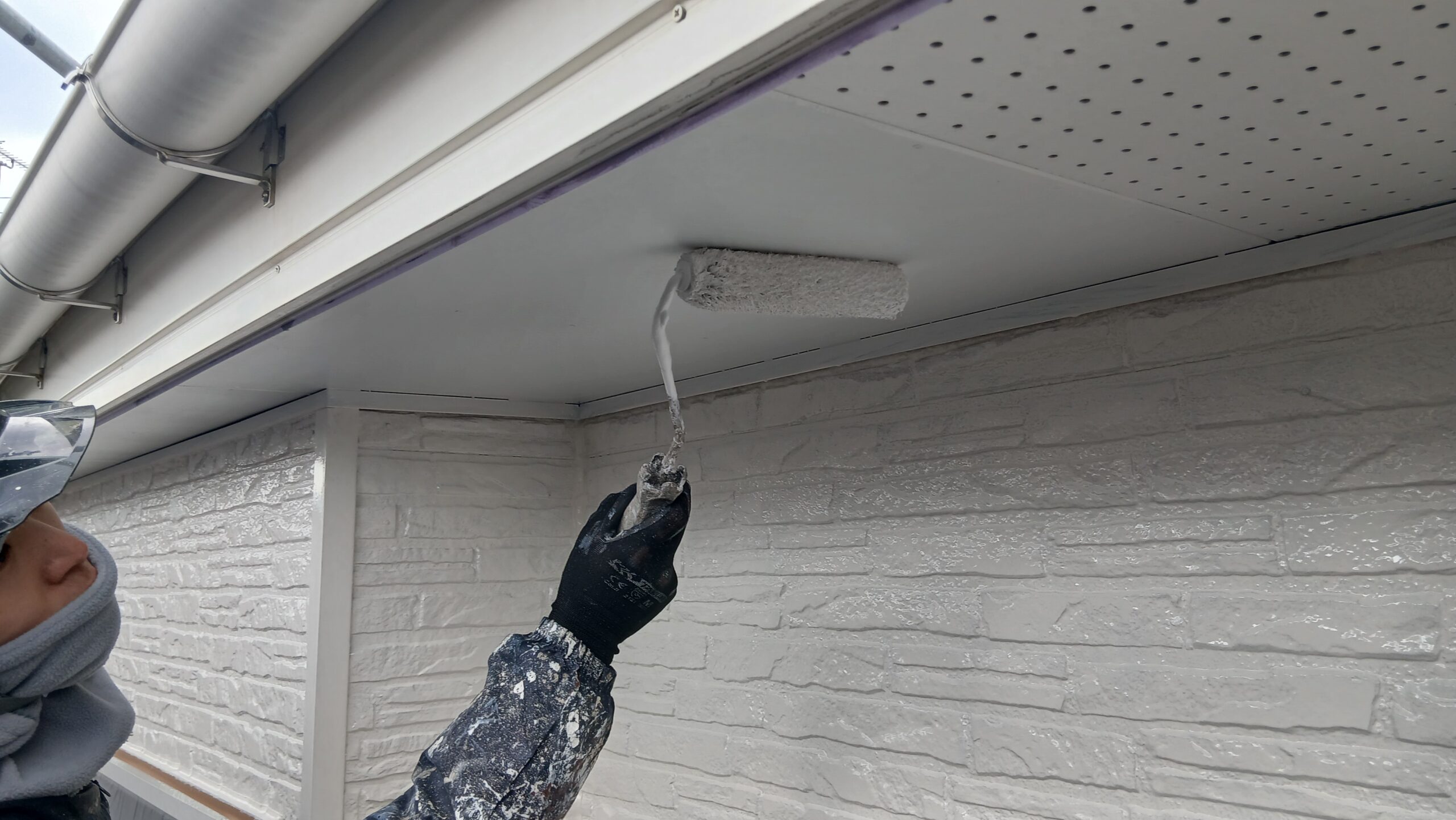 雨樋と外壁の中塗りと軒天の上塗りをしました。